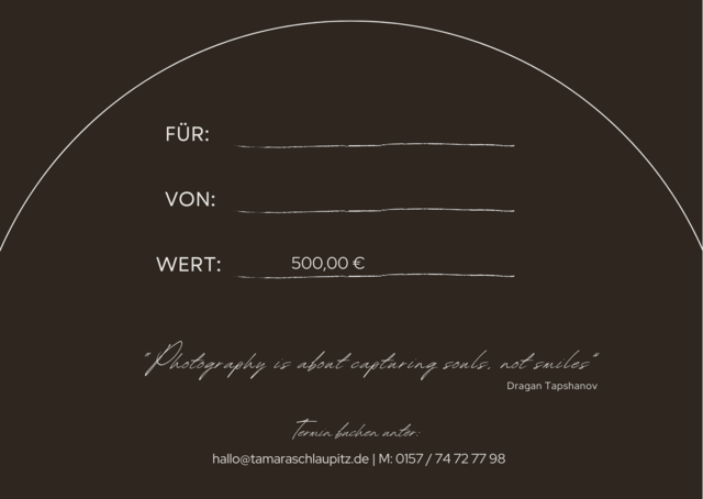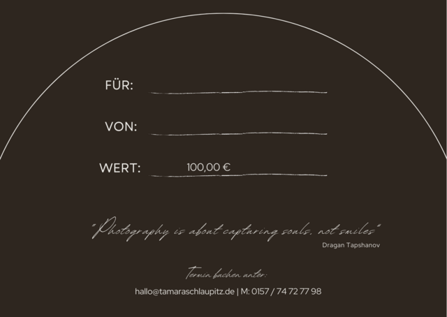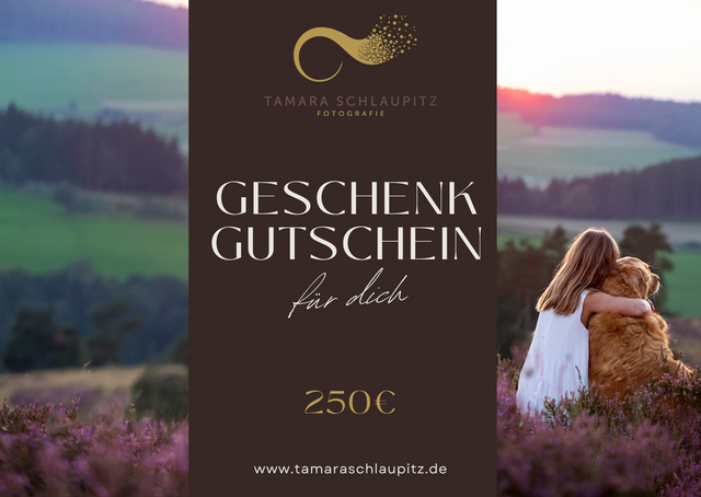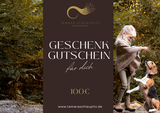 Verschenke einen Gutschein für ein unvergeßliches Erlebnis mit Bildern, die den Beschenkten ein lebenlang begleiten werden. Egal ob für Mum & Dad to be, die junge Familie, den Tierliebhaber oder das Brautpaar. Mit einem so persönlichen Geschenk bringst Du die Augen des Beschenkten ganz sicher zum Leuchten und seine Dankbarkeit ist Dir gewiss.